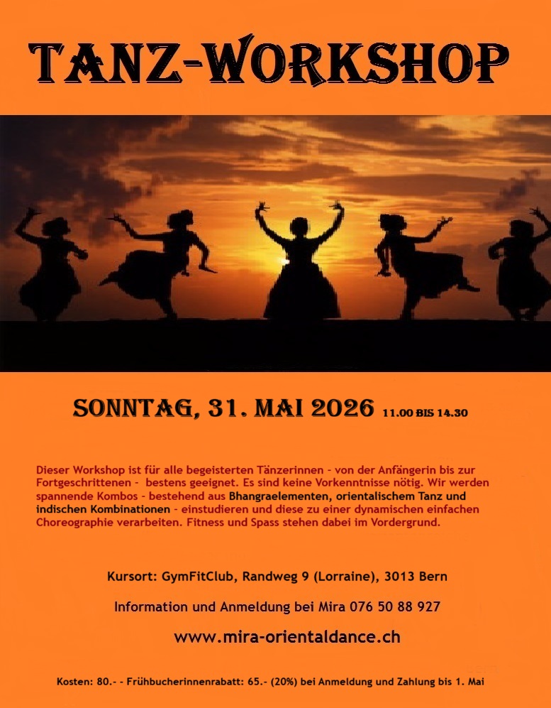 Weitere Workshops folgen am 6. September (Tribalfusion zu Smetana's Moldau) und am 25. Oktober (Shimmy-Choreographie).